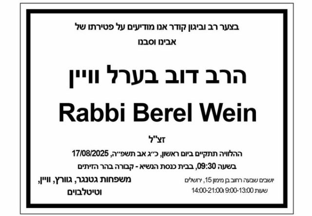 במהלך השבת נפטר בביתו בירושלים הרב דב בערל וויין בגיל 91. בעשרות השנים האחרונות כיהן הרב כרב בית הכנסת "הנשיא" בשכונת רחביה בירושלים.