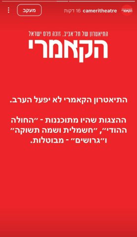 גם תיאטרון הקאמרי הוציא הודעה דומה, ומטעמם נמסר: "התיאטרון הקאמרי לא יפעל הערב". ההצגות שהתבטלו בקאמרי הן "החולה ההודי", "חשמלית ושמה תשוקה", ו-"גרושים".