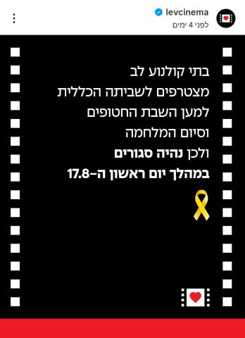 מוסדות תרבות נוספים השביתו את פעילותם. בתי קולנוע לב הוציאו הודעה שמכריזה כי הם "מצטפים לשביתה הכללית למען השבת החטופים וסיום המלחמה, ולכן נהיה סגורים במהלך יום ראשון ה-17.8".