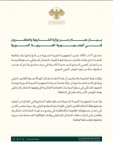 משרד החוץ הסורי פרסם הודעת גינוי חריפה כנגד ישראל, בהודעה טוענים השלטונות הסוריים כי מטוסי קרב ישראלים ביצעו תקיפות בלילות האחרונים, שעלו בחייהם של אנשי הממשל ופגעו ב"ציוד צבאי בבעלות המשטר".