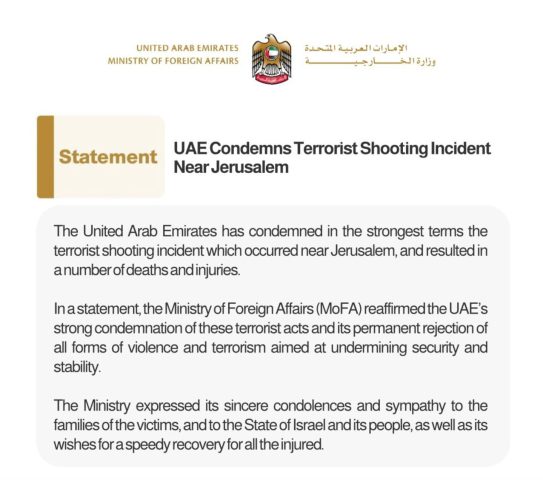 גינוי ראשון לפיגוע הקטלני בירושלים מגיע מהעולם הערבי: איחוד האמירויות פרסמה הצהרה רשמית ובה גינוי חריף לפיגוע שאירע בשכונת רמות בירושלים, בו נהרגו 6 אזרחים בידיי שני מחבלים ערבים.