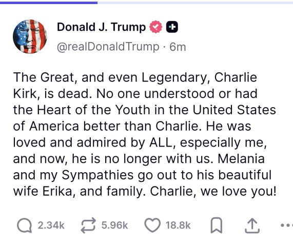 נשיא ארה"ב הודיע באופן אישי: "ה (איש) הנהדר ואפילו האגדי, צ'ארלי קירק, מת. אף אחד לא הבין או פנה ללבבות הצעירים בארה"ב יותר טוב מצ'ארלי. הוא היה אהוב ונערץ על ידי כולם, ובמיוחד על ידי. הוא איננו איתנו יותר. מלאניה ואני מוסרים את תנחומינו לאשתו אריקה ולמשפחתו".