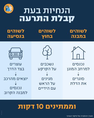 בהודעת פיקוד העורף נכתב: "התקבלה התרעה באזורכם? כך עליכם לפעול כאשר אתם נמצאים במבנה, בשטח פתוח או בנסיעה: זכרו כי יש להמתין 10 דקות, לא פחות, מחשש לירי ממושך ופגיעה משברי יירוט שעדיין לא נחתו על הקרקע".