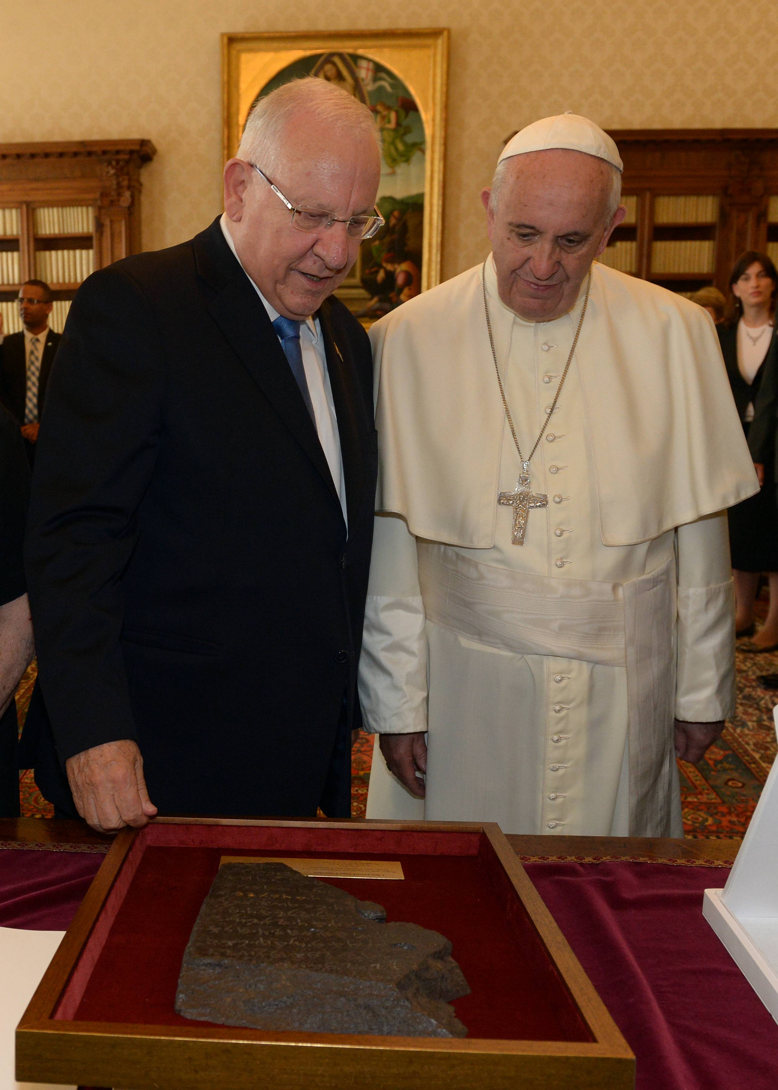במהלך טקס החלפת המתנות, העניק הנשיא לאפיפיור רפליקה של כתובת "תל דן" המכונה כתובת בית דוד. הנשיא אמר לאפיפיור כי הכתובת מבטאת את שורשי מלכות בית דוד, שורשים החשובים הן ליהדות והן לנצרות.