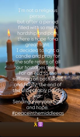 "אני לא אדם דתי, אבל אחרי תקופה מלאה כל כך בכאב ובקושי, יש תקווה לאור גדול. החלטתי להדליק נר ולהתפלל לחזרתם הבטוחה של כל החטופים הביתה. לסיום הסבל משני הצדדים, ולסיום המלחמה הכואבת והבלתי נסבלת הזו. שולחת לכולם אור ותקווה." #שלום במזרח התיכון