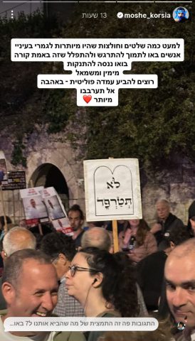 הוא צילם שלט שהופנה נגד ראש הממשלה בנימין נתניהו, והוסיף: "למעט כמה שלטים וחולצות שהיו מיותרים לגמרי בעיניי, אנשים באו לתמוך, להתרגש ולהתפלל שזה באמת קורה. בואו ננסה להתנקות מימין ומשמאל, רוצים להביע עמדה פוליטית – באהבה. אל תערבבו. מיותר."