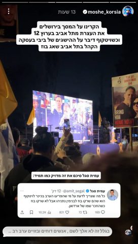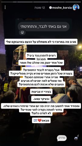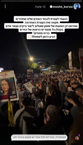 הסטורי של הזמר ואושיית הרשת משה כורסיה נפתח בכך שכתב: "הגעתי לעצרת לכבוד האחים שלנו שחוזרים, מקווה שזו עצרת האחרונה. מהיום רק הופעות של ששון שאולוב, ליאור נרקיס ועומר אדם בקפלן כל מוצש, רמות של החיים. בכינו מספיק! הגיע הזמן לשמוח!"