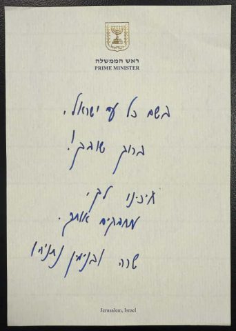 לכל אחת מהערכות צורף פתק אישי החתום בידי ראש הממשלה ורעייתו, ובו נכתב: