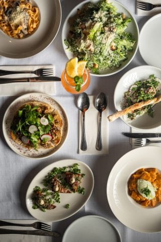 המסעדה מתחילה את חווית הארוחה עם פתיחים קלילים כמו עלי גפן על מצע קרם פרש, זיתים צבעוניים ושקדים קלויים. במנות הראשונות תמצאו את הבוראטה של שקד המפורסמת עם עגבניות שרי, בצל סגול ובלסמי מצומצם, לצד סלט "הולה הולה" עם ירקות שוק טריים וגבינת פטה.