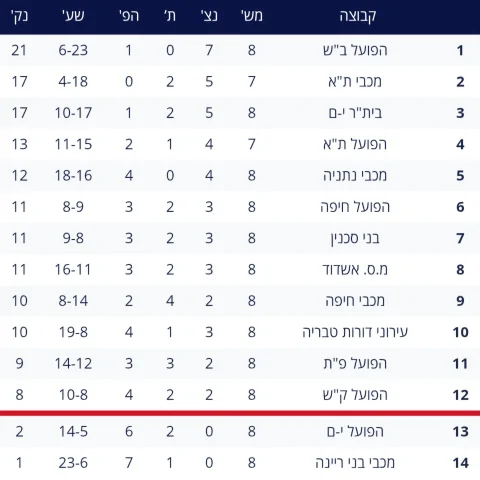 אחרי שמונה מחזורים ליגת העל מתחילה לתפוס צורה כשהפועל באר שבע ראשונים עם 21 נקודות ואחריה מכבי תל אביב (עם משחק חסר ובית"ר ירושלים עם 17 נקודות. בתחתית יש לנו עדיין שתי קבוצות ללא ניצחון, הפועל ירושלים (2 נקודות) ובני ריינה עם נקודה בלבד.
