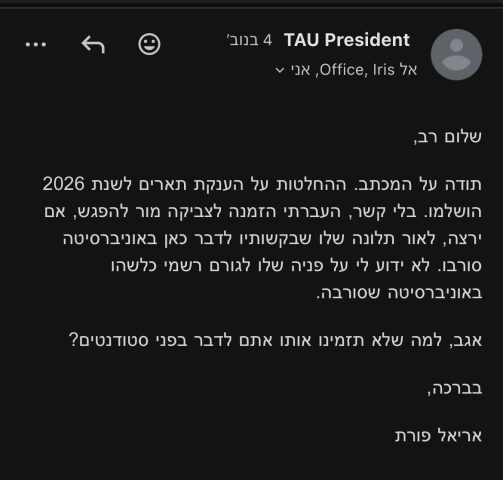 בהודעתו לתא דרור התייחס נשיא האוניברסיטה אריאל פורת לבקשת הסטודנטים להעניק תואר לשם כבוד לצביקה מור, זאת על רקע החלטת האוניברסיטה להעניק תואר דומה לעינב צנגאוקר, וטען כי הענקת התארים לשנת 2026 הסתיימה. הסטודנטים מבהירים כי בכוונתם לבקש את הענקת התואר בשנת 2027, למרות שלדבריהם "היה ראוי שהתואר יוענק כבר השנה, ולמעשה גם בשנה שעברה".