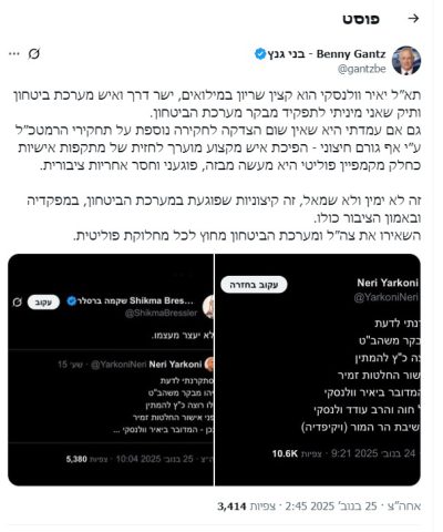 עוד הוסיף: "זה לא ימין ולא שמאל, זה קיצוניות שפוגעת במערכת הביטחון, במפקדיה ובאמון הציבור כולו. השאירו את צה״ל ומערכת הביטחון מחוץ לכל מחלוקת פוליטית".