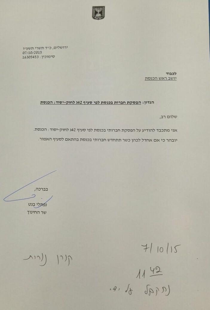 שר החינוך ויו״ר הבית היהודי הגיש ליו״ר הכנסת מכתב התפטרות לפיו בהתאם ל'חוק הנורבגי', הוא מבקש להתפטר מהכנסת ולהמשיך לכהן כשר החינוך. התפטרותו תיכנס לתוקפה תוך 48 שעות מהגשת המכתב.