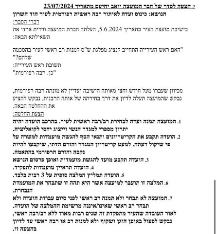 המועצה עם הצעה לא חוקית לסדר היום של המועצה להקמת ועדת בחירות ולמינוי רבה רפורמית עוד לפני שמשרד הדתות חשב בכלל להניע תהליך לבחירת רב בהוד השרון.