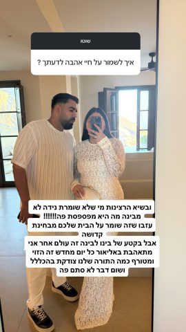 "עזבו שזה שומר על הבית שלכם מבחינת קדושה, אבל בקטע של בינו לבינה זה עולם אחר". פינטו מסבירה שזה ממש מסייע להם לאהוב יותר ויותר. "אני מתאהבת באליאור כל יום מחדש. זה הזוי ומטורף כמה התורה שלנו צודקת בהכל, ושום דבר לא סתם פה".