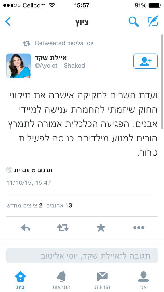 בנוסף, בחשבון הטוויטר שלה כתבה שקד כי תיקוני החוק הם יוזמה שלה: "ועדת השרים לחקיקה אישרה את תיקוני החוק שיזמתי להחמרת ענישה למיידי אבנים. הפגיעה הכלכלית אמורה לתמרץ הורים למנוע מילדיהם כניסה לפעילות טרור".