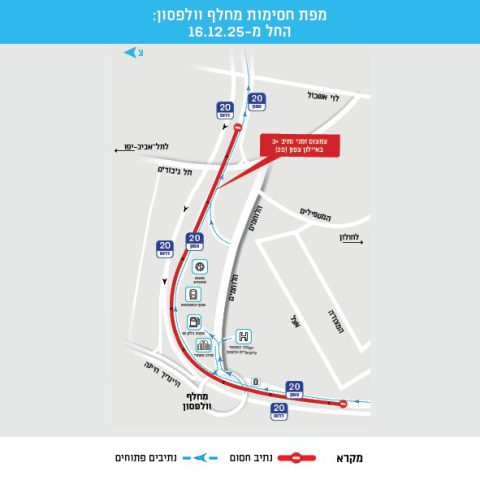 משרד התחבורה מודיע היום (שני) על פריסת הסדר תנועה חדש בכביש 20 לכיוון צפון, כחלק מהמשך קידום פרויקט הנתיבים המהירים. החל ממחר(שלישי), בשעה 05:00, ולמשך כחודש וחצי, יצומצם זמנית הנתיב השמאלי (+3), המשמש כנתיב רב תפוסה, באזור מחלף וולפסון.