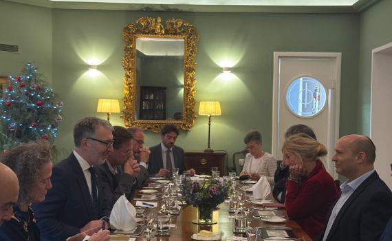ראש הממשלה לשעבר נפתלי בנט, קיים מפגש הסברה מיוחד עם 15 שגרירים זרים, בבית שגריר בריטניה בישראל, סיימון וולטרס.