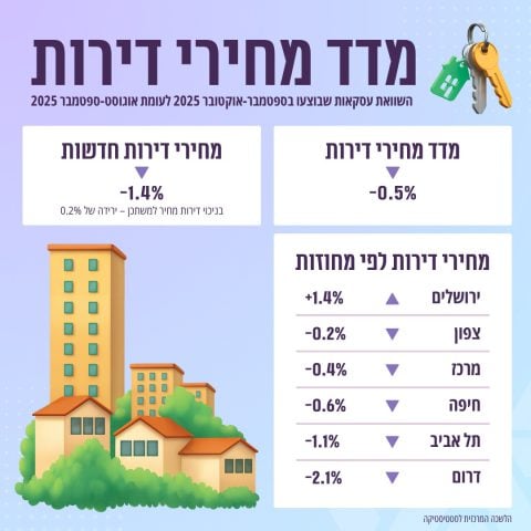 השוואת מחירי העסקאות שבוצעו בספטמבר–אוקטובר 2025 לעומת אוגוסט–ספטמבר 2025 מצביעה על ירידה של 0.5% במחירי הדירות. לפי מחוזות נרשמו שינויים כדלקמן, ירושלים עלייה של 1.4%, צפון ירידה של 0.2%, חיפה ירידה של 0.6%, מרכז ירידה של 0.4%, תל אביב ירידה של 1.1%, דרום ירידה של 2.1%. מחירי הדירות החדשות ירדו ב־1.4%.