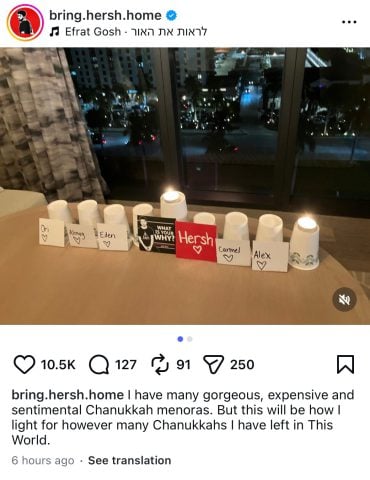 רייצ'ל גולדברג-פולין, אמו של הירש גולדברג-פולין ז"ל, פרסמה היום (שלישי) פוסט ברשתות החברתיות לקראת חג החנוכה, בו התייחסה לבחירתה בדרך שבה היא תדליק את נרות החג בשנים הקרובות. דבריה מגיעים לאחר פרסום סרטון שבו בנה הירש מדליק נרות חנוכה בשבי החמאס