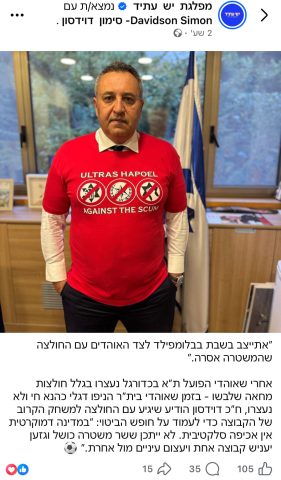 ח״כ סימון דוידסון מיש עתיד, פרסם היום (שלישי) תמונה עם חולצה שהמשטרה אסרה על אוהדי הפועל תל אביב להופיע איתה במשחקים, ובתגובה מפכ"ל המשטרה דני לוי תקף אותו.