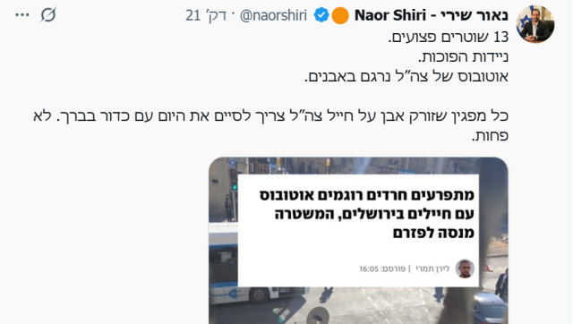 "כל מפגין שזורק אבן על חייל צה"ל צריך לסיים את היום עם כדור בברך. לא פחות", כתב שירי.