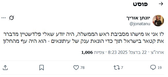 יועץ התקשורת יונתן אוריך פרסם הערב (שני) ציוצים ברשת X, שבהם התייחס להתנהלות סביב פרסומים תקשורתיים הנוגעים לאלי פלדשטיין ולגורמים בסביבת ראש הממשלה.