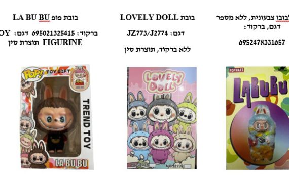 הממונה על התקינה במשרד הכלכלה והתעשייה, מזהיר את ציבור הצרכנים, ההורים והצוותים החינוכיים מפני הסכנה בשימוש במספר דגמים של צעצועי בובות לבובו (LABUBU) וזאת בשל חשש לבריאותם ובטיחותם של משתמשים