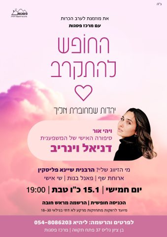 ההרצאה של דניאל וינריב, שתתמקד בסיפור חייה האישי ובמסע ההתחזקות שלה, תתקיים ב-15 בינואר במרכז פסגות בפתח תקווה. היא מיועדת במיוחד לצעירות רווקות מתחזקות, בעלות רקע לא דתי כמוה. "אני מאוד נרגשת לשתף ולספר על המסע האישי שלי ביהדות", סיפרה לסרוגים.