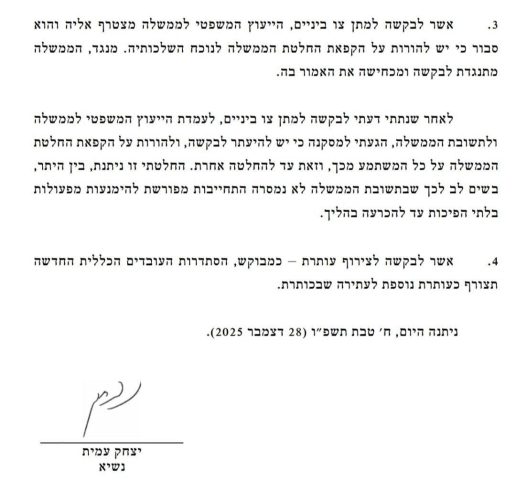 עוד אמר השופט עמית: "לאחר שנתתי דעתי לבקשה למתן צו ביניים, לעמדת הייעוץ המשפטי לממשלה ולתשובת הממשלה, הגעתי למסקנה כי יש להיעתר לבקשה, ולהורות על הקפאת החלטת הממשלה על כל המשתמע מכך, וזאת עד להחלטה אחרת. החלטתי זו ניתנת, בין היתר, בשים לב לכך שבתשובת הממשלה לא נמסרה התחייבות מפורשת להימנעות מפעולות בלתי הפיכות עד להכרעה בהליך".