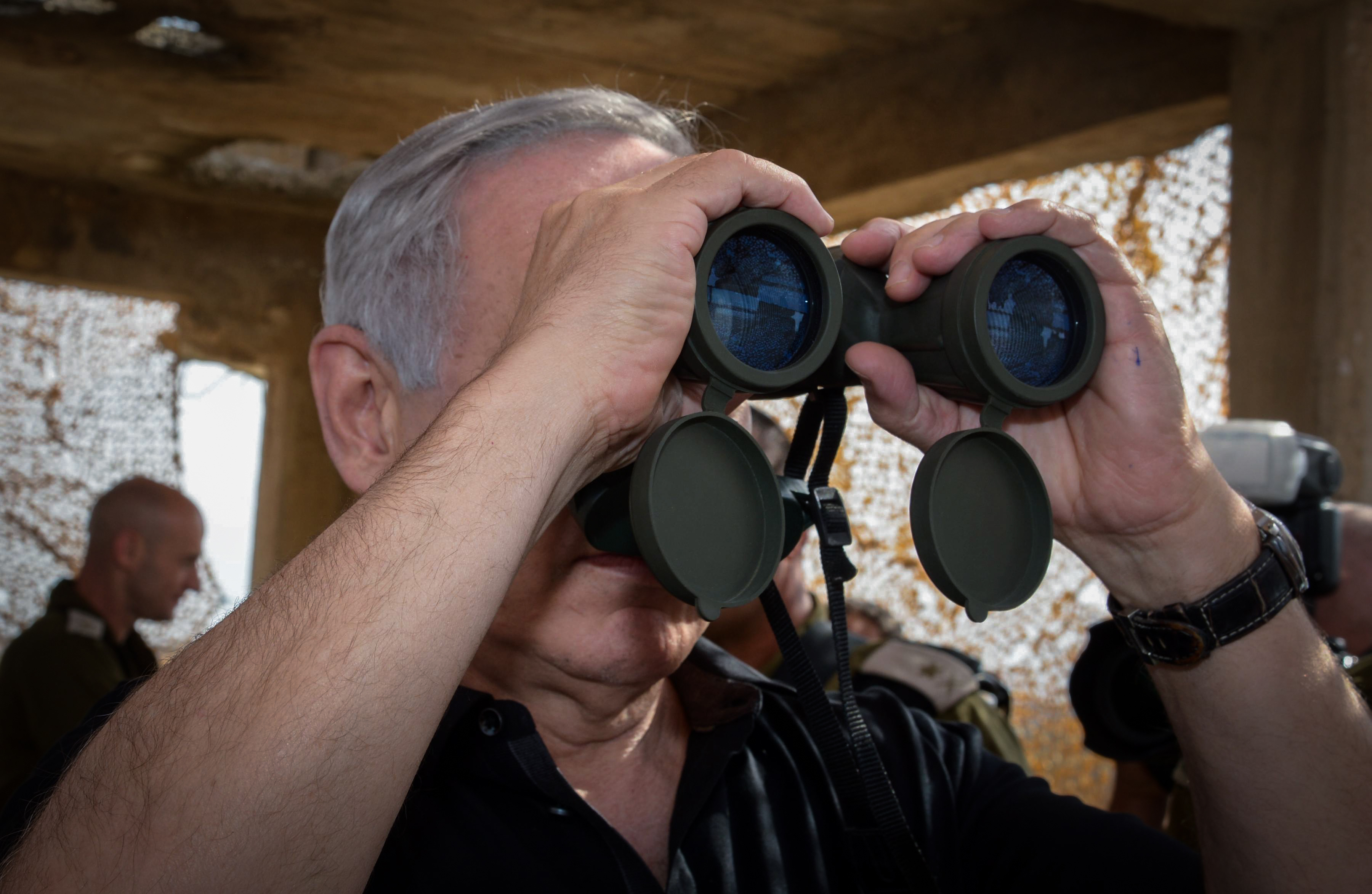 לאחר מכן הגיע רה"מ נתניהו לנקודת תצפית על רצועת עזה. שם אירעה לו תקרית מביכה כשהגיע להביט במשקפת, שכח להוריד את כיסויי ההגנה ותועד בידי צלם ידיעות אחרונות. בפוזה דומה צולם בעבר שר הבטחון עמיר פרץ, מה ששם אותו ללעג ברשת, בגלל חוסר נסיונו הבטחוני.
