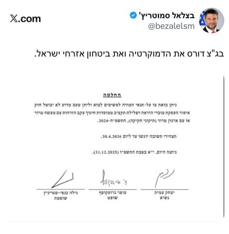 כעת, שר האוצר מאשים את בג"ץ בפגיעה בביטחון אזרחי המדינה. סמוטריץ' פרסם פוסט ברשתות וכתב "בג"ץ הורס את הדמוקרטיה ואת ביטחון אזרחי ישראל".