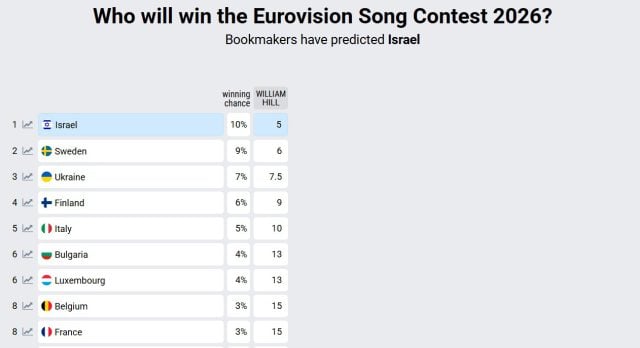 נזכיר כי בחודש שעבר לפי סוכנות ההימורים Betfair, שהיא הראשונה לפרסם את הסיכויים לזכייה בנושא, גם שם ישראל הייתה המובילה בקרב המהמרים לזכות בתחרות השירים הנצפית באירופה. בשנה שעברה ישראל זכתה במקום הראשון בהצבעת הקהל, מה שהביא אותה למקום ה-2 והמכובד באירוויזיון.