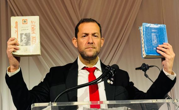 בכנס הענק של ארגון JPB שנערך אמש במאר-א-לגו שבפלורידה, אחוזתו של הנשיא טראמפ, השתתפו מאות רבים של מנהיגים, חברי קונגרס, חברי בתי נבחרים מארה"ב, חברי פרלמנטים מרחבי העולם ומנהיגים אוונגליסטים, בעיצומו של האירוע, הוזמן ראש מועצת שומרון לנאום בפני המשתתפים. בשיאו של הנאום הציג דגן למשתתפים ספר "מיין קאמפף" בערבית שנמצא בבית ספר בעזה.