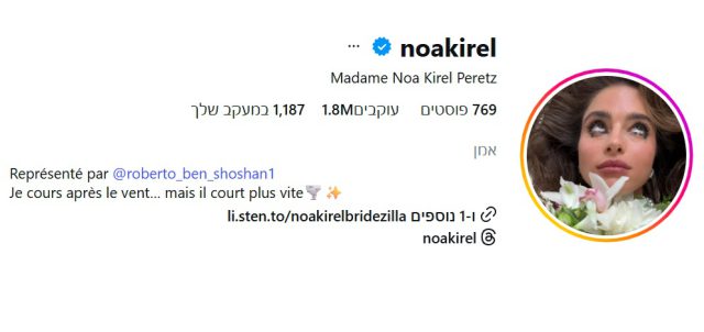 נועה קירל ודניאל פרץ התחתנו בחודש נובמבר האחרון וכעת קירל עושה את הצעד המתבקש – ומשנה באופן רשמי את שם משפחתה ברשתות החברתיות.