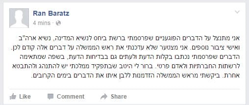 "אני מתנצל על הדברים הפוגעניים שפרסמתי ברשת ביחס לנשיא המדינה, נשיא ארה"ב ואישי ציבור נוספים. אני מצטער שלא עדכנתי את ראש הממשלה על דברים אלה קודם לכן. הדברים שפרסמתי נכתבו בקלות הדעת ולעתים גם בבדיחות הדעת, בשפה שמתאימה לרשתות החברתיות ולאדם פרטי.", כתב הערב ברץ בחשבון הפייסבוק שלו.