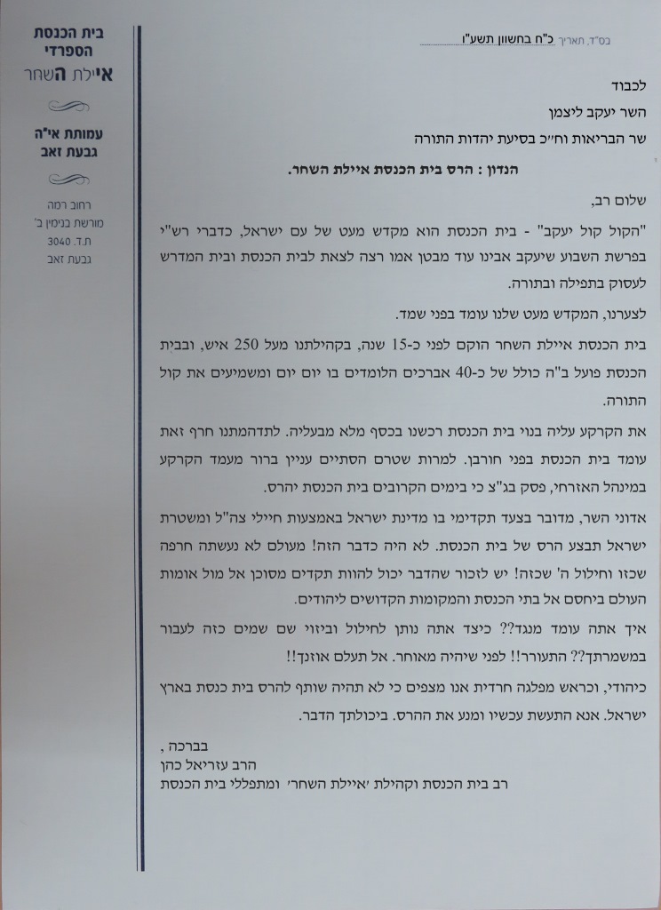 בתוך כך, הערב שיגר הרב עזריאל כהן, רב בית הכנסת איילת השחר, מכתב לשרים דרעי, בנט וליצמן בקריאה לפעול למניעת הרס בית הכנסת, תוך שהוא מדגיש שהרס בית הכנסת בידי מדינת ישראל עלול להוות פתחון פה לאומות העולם ביחסם למקומות הקדושים ליהודים.