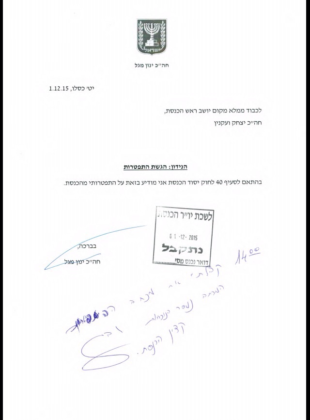 חבר הכנסת ינון מגל הגיש את מכתב ההתפטרות לממלא מקום יו"ר הכנסת יצחק ועקנין, כפי שמחייב תקנון הכנסת. המכתב הוגש לסגן יו"ר הכנסת משום שהיו"ר יולי אדלשטיין שוהה בחוץ לארץ במסגרת ביקור רשמי בגרמניה.