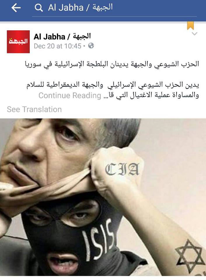בסרוגים פרסמנו היום (ג') כי בדף הפייסבוק של המפלגה בערבית מאשים את ראש הממשלה, בנימין נתניהו, ברצח הטרוריסט סמיר קונטאר ומציג אותו כפעיל של ארגון הטרור דאע"ש. עוד נאמר בפוסט כי "מעשה זה של תוקפנות, מאשר מחדש את עומק המעורבות הישראלית במה שקורה בסוריה". בפוסט מזהירה המפלגה כי פעולת ישראל תביא לתוצאות חמורות שמדינת ישראל תישא את האחריות עליהן. המפלגה אף מאשימה את ישראל בשיתוף פעולה עם ארה"ב, טורקיה, ערב הסעודית, קטאר ועם חלק מהכוחות הפועלים בסוריה, המכונים בפוסט "כוחות טרור".