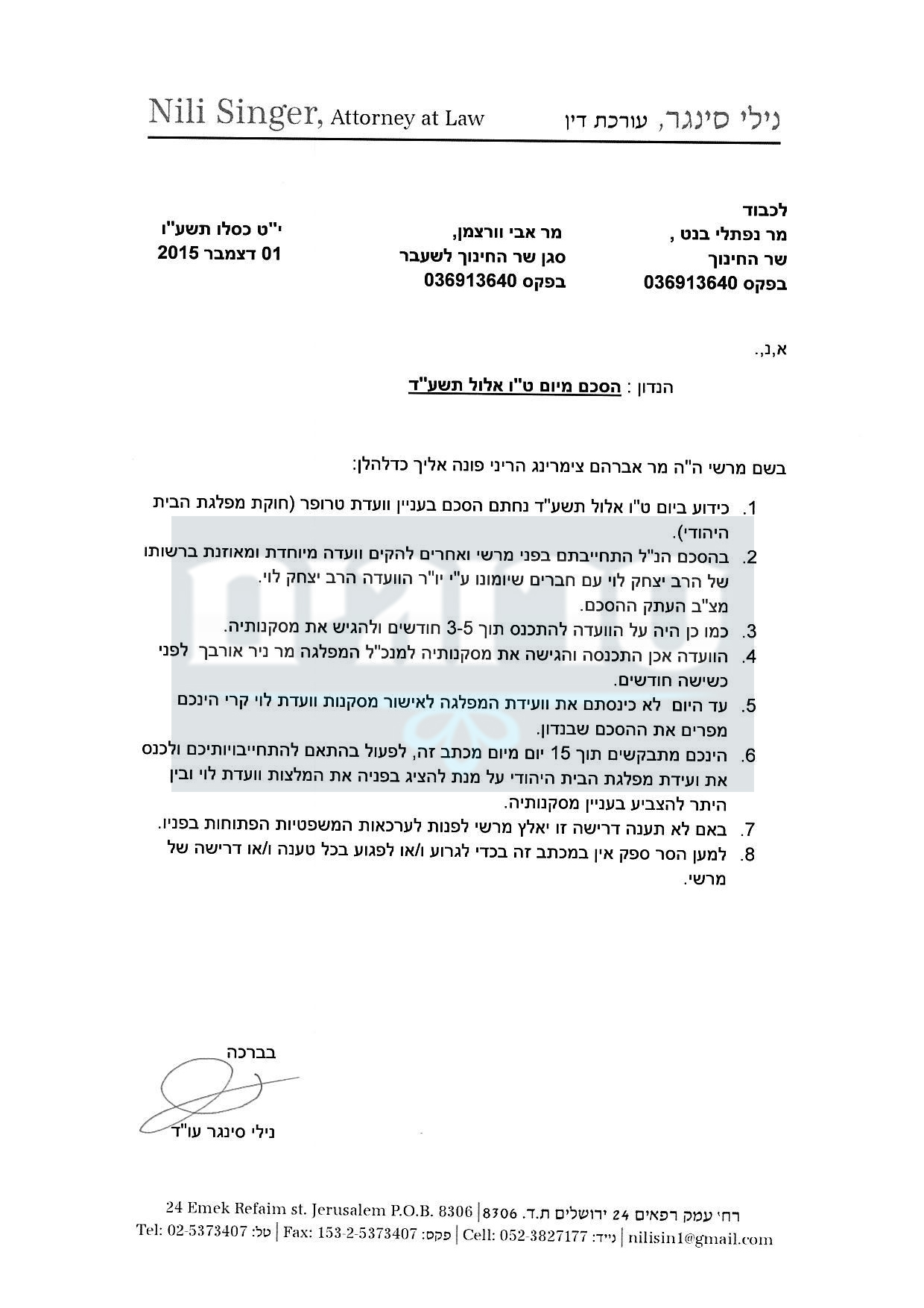 "הינכם מתבקשים תוך 15 מיום מכתב זה, לפעול בהתאם להתחייבויותיכם ולכנס את ועידת מפלגת הבית היהודי על מנת להציג בפניה את המלצות ועדת לוי ובין היתר להצביע בעניין מסקנותיה." בסוף המכתב מוסיפה באה כוחו של צימרינג איום: "באם לא תענה דרישה זו יאלץ מרשי לפנות לערכאות המשפטיות הפתוחות בפניו".