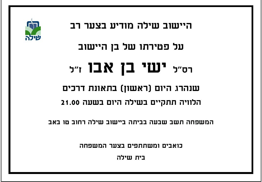 רס"ל ישי בן אבו ז"ל, תושב הישוב שילה בן 25 במותו, שרת בצבא קבע, הותיר אחריו הורים, 8 אחים ואחות.