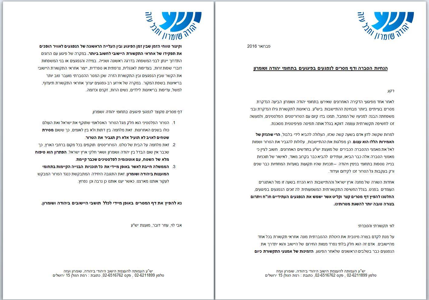 במסמך הנושא את לוגו מועצת יש"ע וחתום על ידי אבי לוי, עוזר דובר מועצת יש"ע, נטען כי הוא נכתב בעקבות תגובתה של מיכל פרומן לפיגוע הדקירה בה נפצעה וגילויי ההבנה למניעיו של המחבל ותמיכה בדו קיום עם הטרוריסטים הפלסטיני.