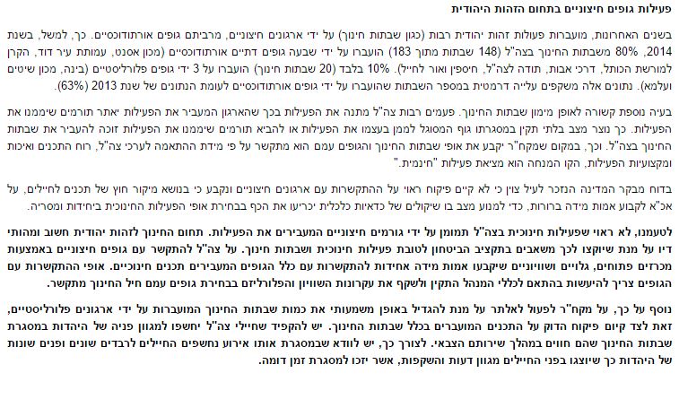 בהמשך נכתב כי "פעילות הענף היתה בבחינת כפייה דתית שהופעלה על קהל שבוי… מצב בו גוף בעל אג'נדה דתית פוליטית מתווה כיצד יראה החינוך לזהות יהודית הוא מסוכן, אנטי דמוקרטי ושומט את היסודות של צה"ל כצבא העם." על כך שדמוקרטיה היא הכרעת הרוב כנראה לא שמעו שם.