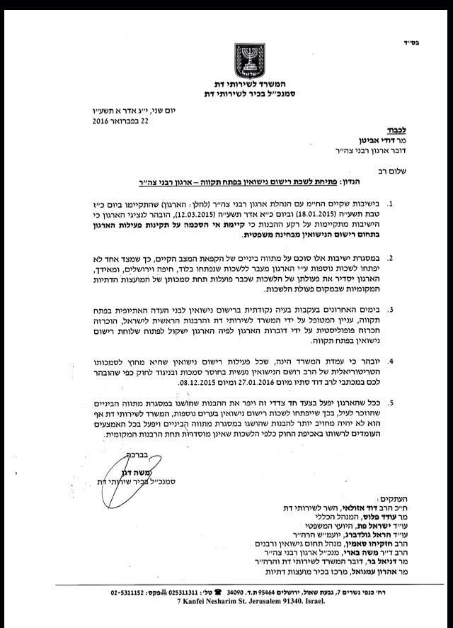 במכתב ששיגר סמנכ"ל המשרד לשירותי דת, משה דגן, לדובר ארגון רבני 'צהר' נאמר כי כבר בישיבה שנערכה לפני כשנה הובהר לגורמים בארגון כי פעילותם בתחום רישום הנישואים אינה תקינה מבחינה משפטית.