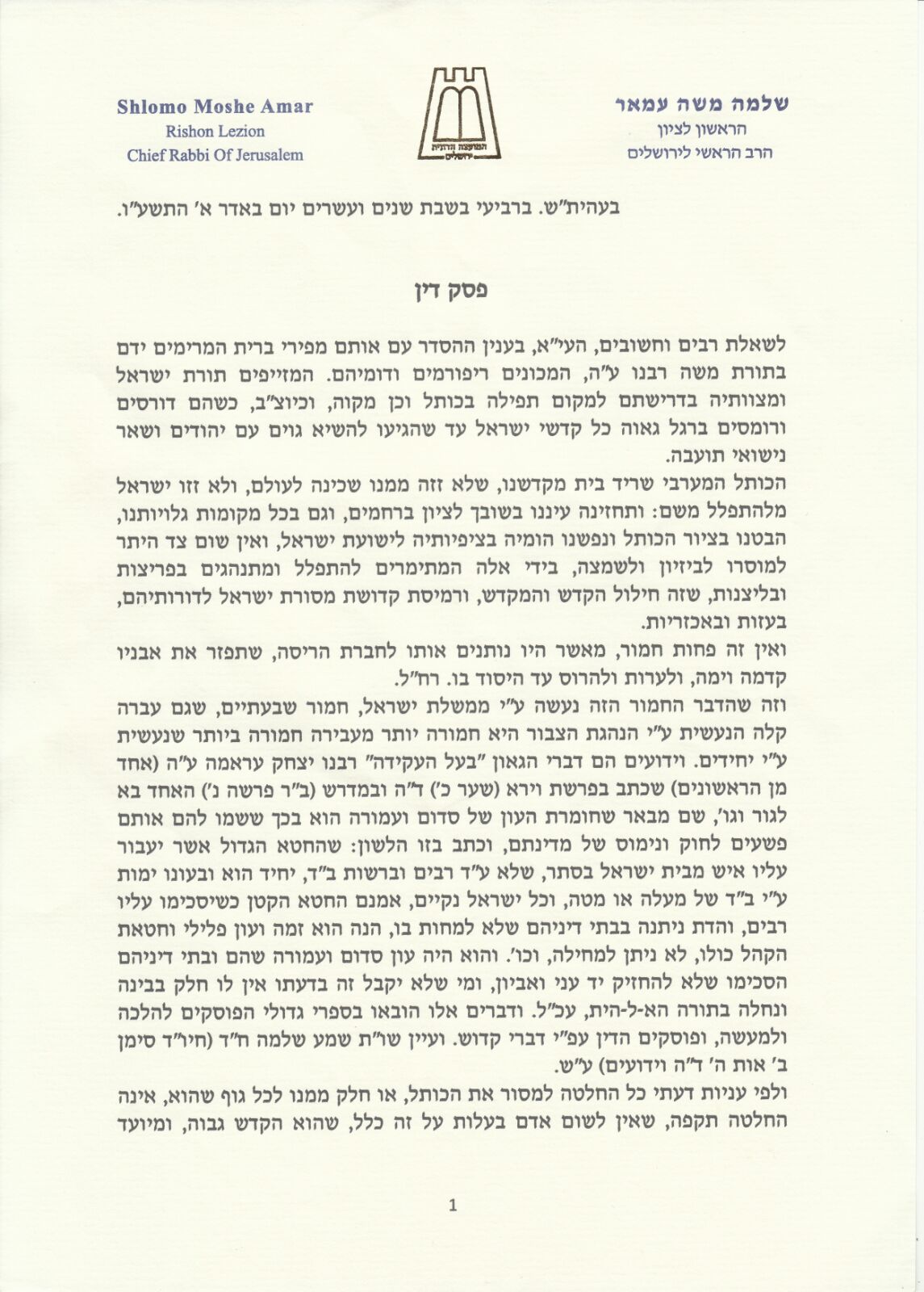 ערב פגישת הרבנים הראשיים לישראל עם ראש הממשלה בנושא הכותל מפרסם מרן הראשון לציון רבה של ירושלים הרב שלמה עמאר גילוי דעת חריף ביותר נגד מסירת הכותל לידיהם.