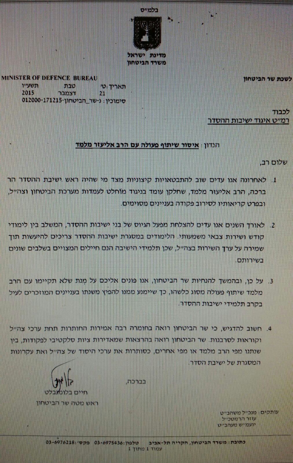 "אנו פונים אליכם על מנת שלא תקיימו עם הרב מלמד שיתוף פעולה מסוג כלשהו, כך שיימנע ממנו להפיץ משנתו בעניינים המוזכרים לעיל בקרב תלמידי ישיבות ההסדר… שר הביטחון רואה בחומרה רבה אמירות החותרות תחת ערכי צה"ל וקוראות לסרבנות. שר הביטחון רואה בהרצאות שמאדירות ציות סלקטיבי לפקודות, בין שנתנו מפי הרב מלמד או מפי אחרים, כסותרות את ערכי היסוד של צה"ל ואת עקרונות המסגרת של ישיבות ההסדר".