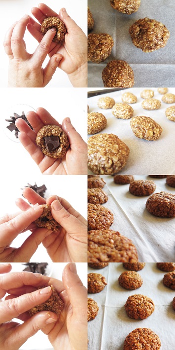 - בעזרת האצבע יוצרים גומה בכל כדור ומכניסים לתוכו קוביית שוקולד. מהדקים חזרה את הבצק סביב באופן אחיד עד כמה שניתן ומניחים על מגש התנור מרופד בנייר אפיה. (אם הבצק נדבק לידיים ניתן להרטיב אותן מעט.
