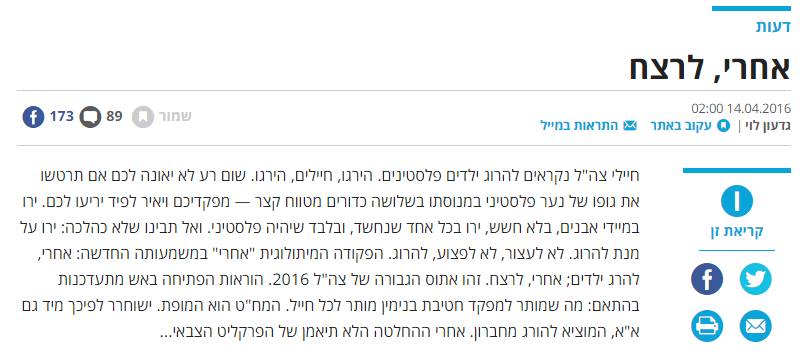 "מי שמציג את חיילינו כרוצחים חסרי אבחנה משקר ביודעין וגם מתיר את דמם. בכל תולדות המלחמות לא היה צבא שעשה יותר כדי לשמור על מוסר הלחימה וטוהר הנשק, אבל את "הארץ" זה לא מעניין. מדובר בעלון רווי בשנאה עצמית של השמאל הקיצוני, והמאמר הזה – כמו מאמרים רבים אחרים – הוא דרכו להכשיר את הטרור. לפי ההגיון שלו, אם יציג את חיילי צה"ל כרוצחים, יוכל לטעון שהחמאס והג'יהאד-האיסלאמי והסכינאים והמחבלים המתאבדים פועלים בעצם ממניעים של הגנה עצמית."
