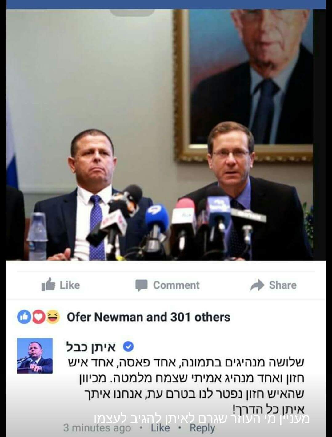 תחת השם איתן כבל, נכתב: "שלושה מנהיגים בתמונה. אחד איש חזון ואחד מנהיג אמיתי שצמח מלמטה. מכיוון שהאיש חזון נפטר לנו בטרם עת, אנחנו איתך איתן כל הדרך".