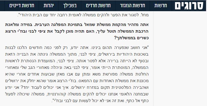 "אני חושב שנפערה תהום בינינו. אתה יודע, רק לפני כמה חודשים הלכנו לבנות בשכונות היהודיות בירושלים, ציפי לבני, מתוך הממשלה גינתה את הבנייה הזאת ובסוף לא הייתה ברירה אלא לפטר אותה. ציפי לבני, המועמדת הנסתרת לראשות הממשלה, המוסתרת הייתי אומר, ציפי לבני באה וניהלה מאחורי הגב שלי ומאחורי החלטת ממשלה מפורשת משא ומתן עם אבו מאזן שבועות אחדים אחרי שהיא מכוננת את ממשלת האחדות עם החמאס. בוז'י הרצוג אומר שהוא יחלק את ירושלים ושהבירה הפלסטינית תקום במזרח ירושלים. איך אני יכולים לעבוד יחד? אני יודע שבמחנה הלאומי אנחנו יכולים להקים ממשלה קוהורנטית, ממשלה שיכולה לפעול כתף אל כתף, ואת זה אני לא יכול לעשות עם לבני ובוז'י".